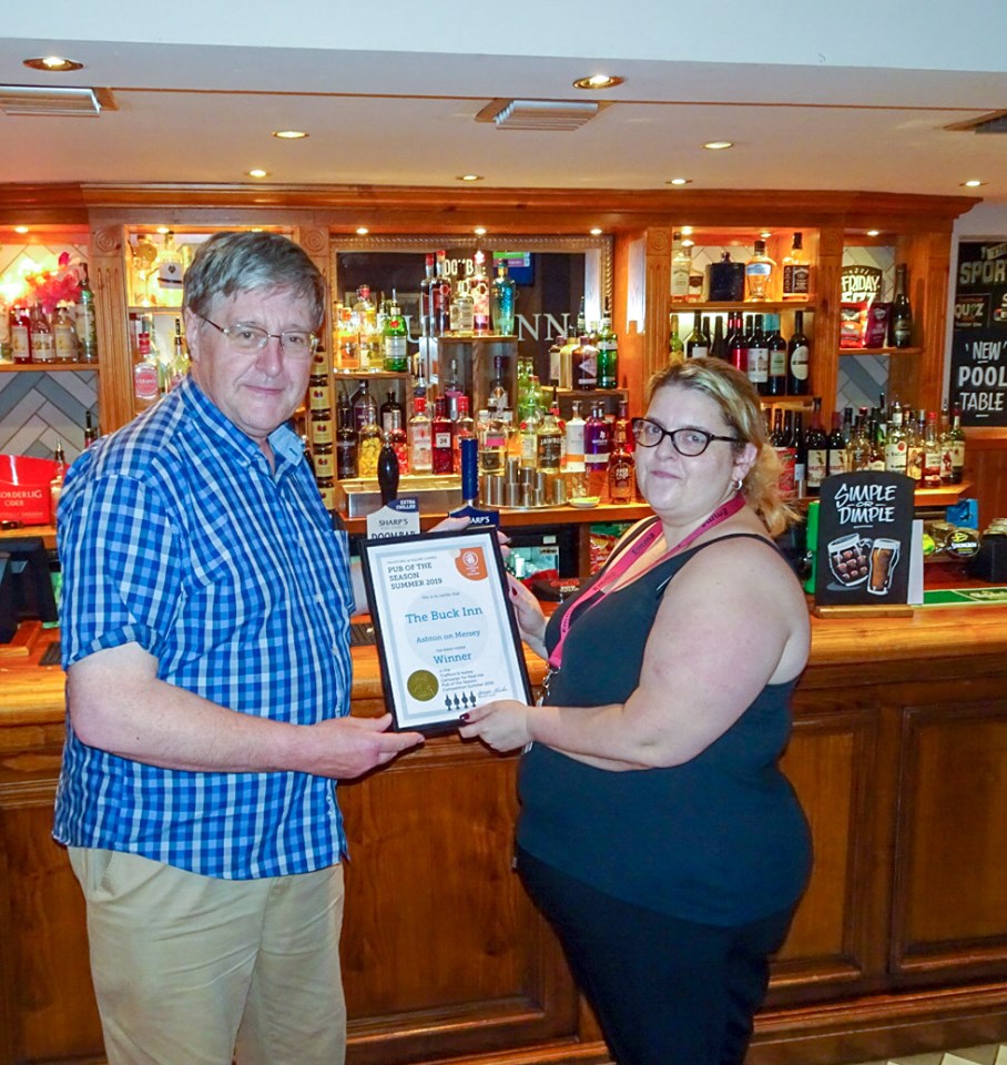 Many congratulations to all at The Buck Inn, Ashton On Mersey winning our Pub of The Season Summer 2019. A popular community pub with food, TV sports, karaoke and quiz night. Here we see Dave Wade from the comittee presenting Emma the manager with the award.